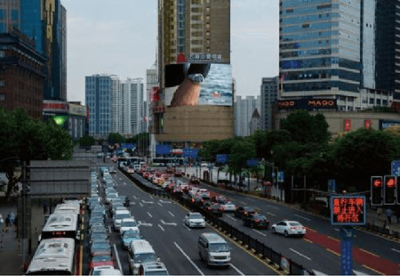 干道:地處繁華的淮海路,是上海中心商業(yè)區(qū)的重要交通路段,且是延安路高架可見(jiàn)最大的LED屏